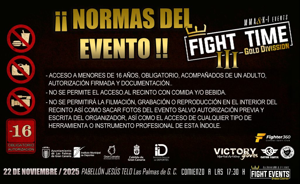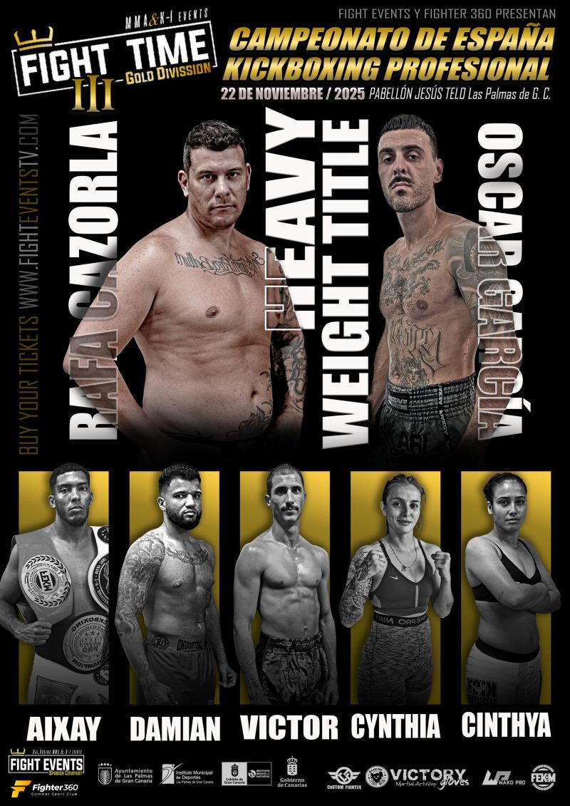 El próximo 22 de noviembre de 2025, el Pabellón Jesús Telo de La Isleta (Las Palmas de Gran Canaria) será el escenario de una noche épica con la tercera edición de FIGHT TIME, el evento insignia de Fight Events, que en esta ocasión pondrá en juego el título oficial del Campeonato de España de Kickboxing Profesional.